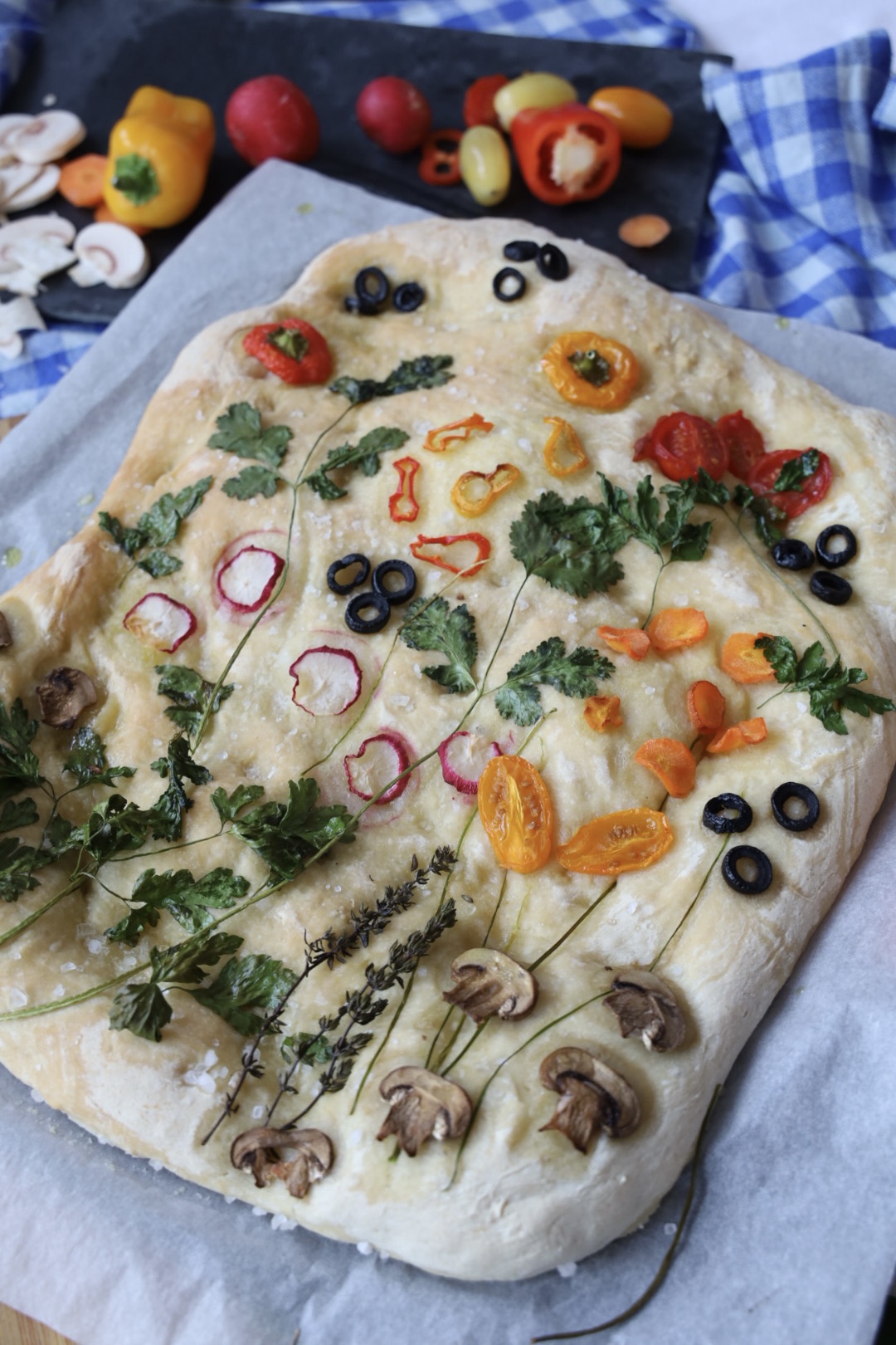 Fiz a massa de acordo com as instruções e depois de levedar reguei com azeite, decorei com salsa, cogumelos, cenoura às rodelas, pimentão, azeitona…